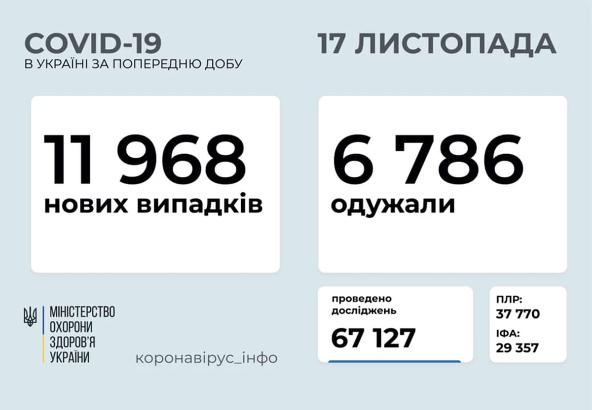 11 968 нових випадків коронавірусної хвороби COVID-19 зафіксовано в Україні станом на 17 листопада 2020 року, повідомляє МОЗ. Зокрема, захворіли 516 дітей та 565 медпрацівників.